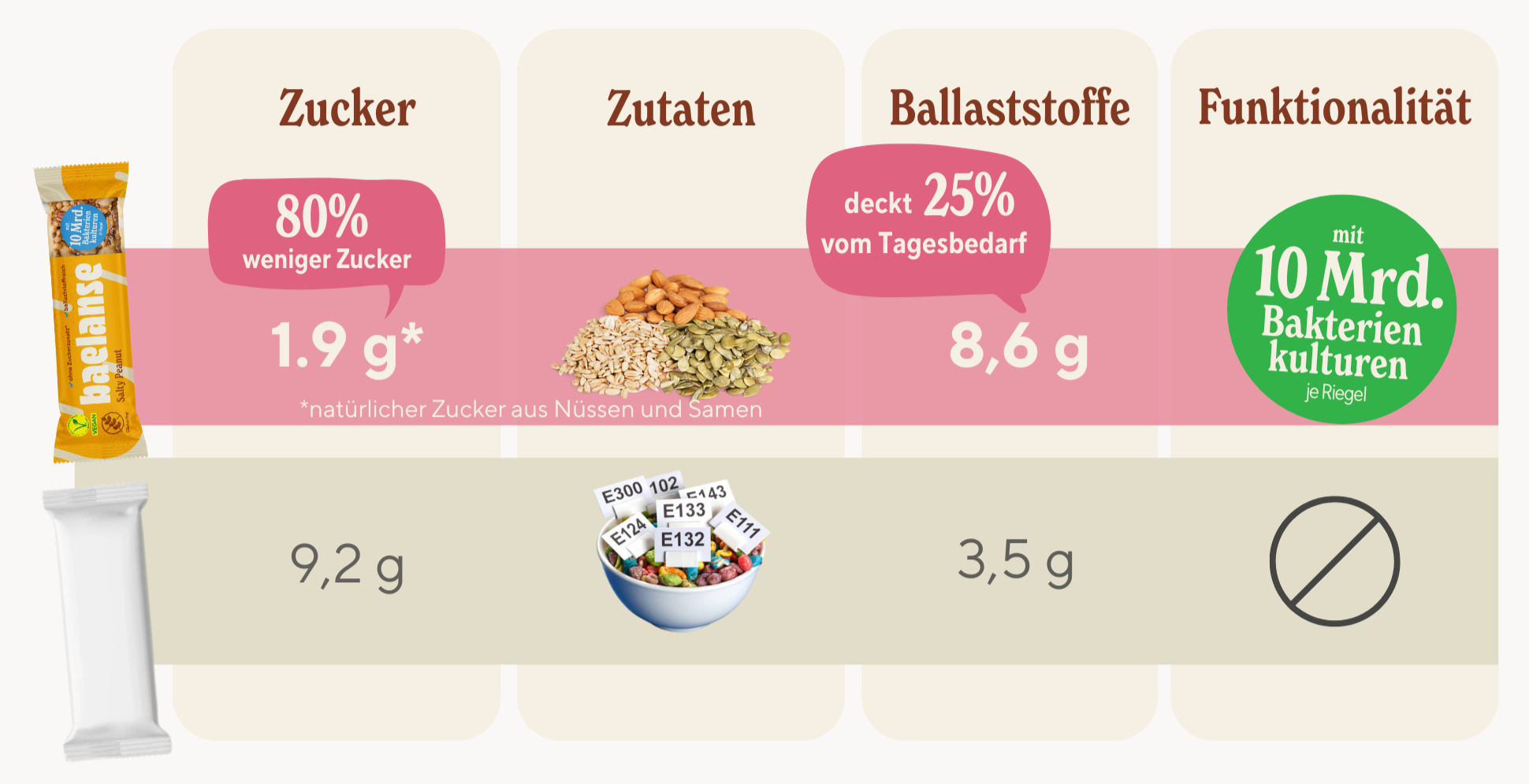 Der baelanse bar ist der erste Riegel mit Bakterienkulturen im DACH-Raum. Entwickelt von der Ernährungswissenschaftlerin Lorena, kombiniert er langanhaltende Sättigung mit spürbarer Darmunterstützung dank löslicher Ballaststoffe und über 10 Milliarden Bakterienkulturen.