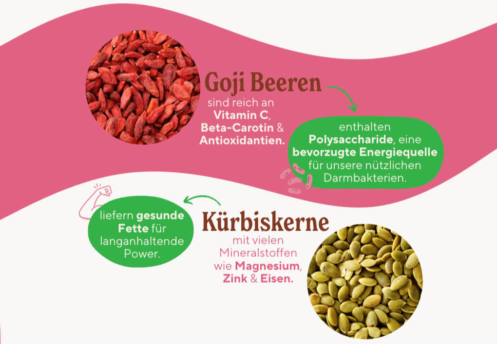 Geröstete Mandeln, geröstete Cashewnüsse, Kürbiskerne, Oligofructose, Puffreis, Gojibeeren [enthält Sulfite] (3%), Inulin, geröstete Sesamsamen, gefriergetrocknete Erdbeeren (2%), Kakaomasse, Bakterienkulturen** [ Lactobacillus lactis, Lactobacillus plantarum, Bifidobacterium bifidum, Bifidobacterium longum ] (0,25%), Meersalz.